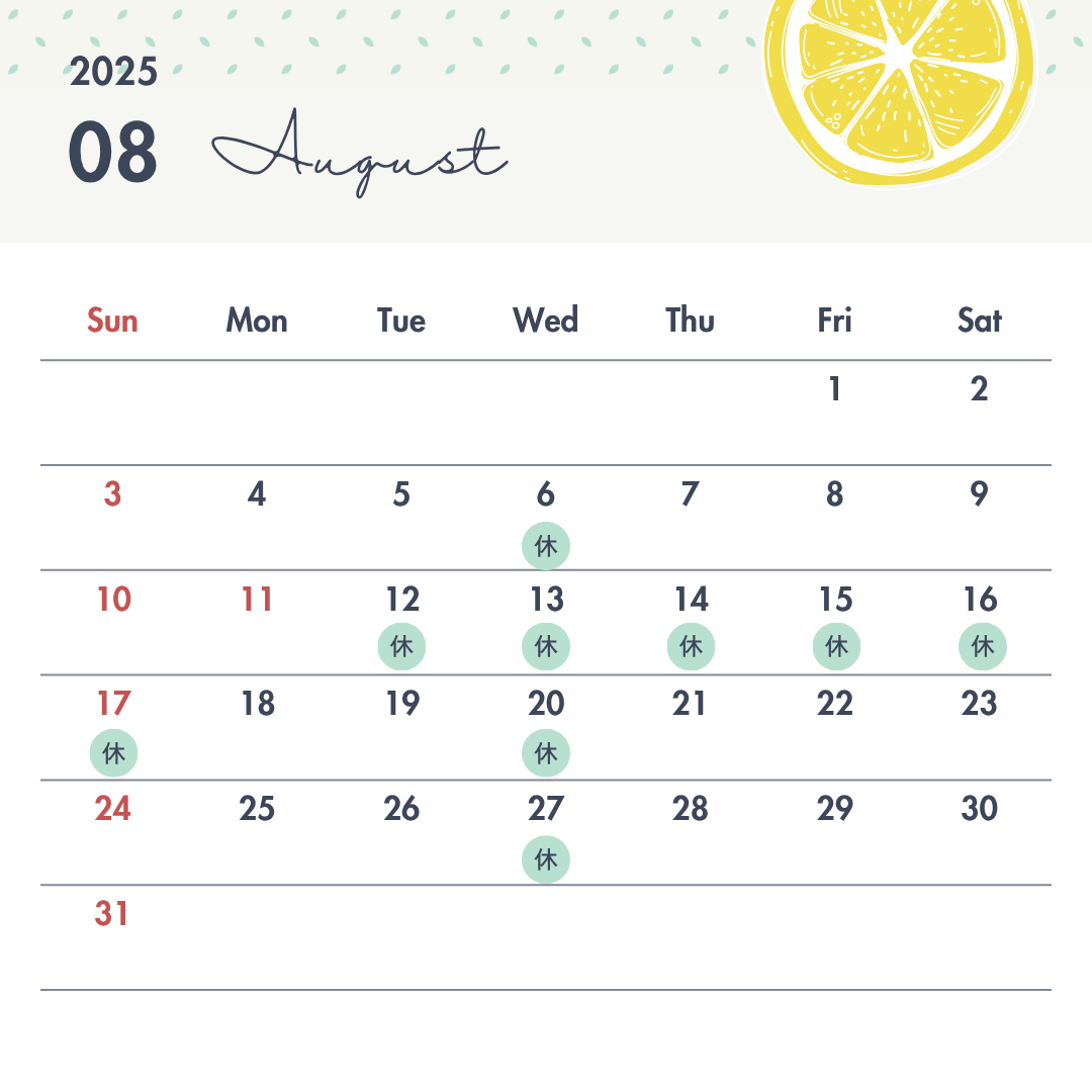 8月定休日・夏季休業日のお知らせ